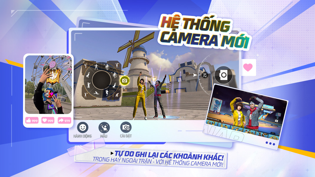 - Bạn có thể dùng Hệ thống Camera trong trận, có tính năng giấu HUD, chỉnh zoom, mẫu ảnh/video, phát lại hành động, và nhiều hơn nữa! Thông tin địch sẽ bị giấu trong chế độ camera.