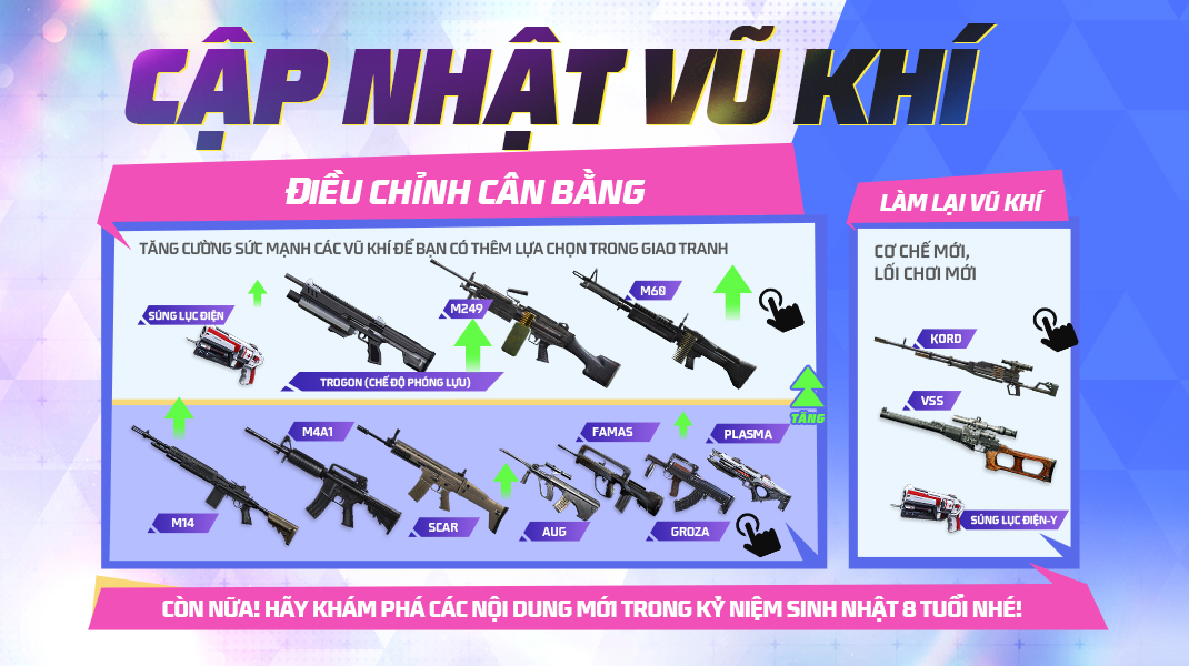 - Điều chỉnh danh sách vũ khí: AWM, SVD, M249, Groza.